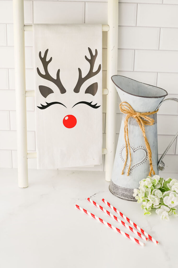 Create adorable reindeer dish towels using Cricut heat transfer vinyl for festive kitchen decor.