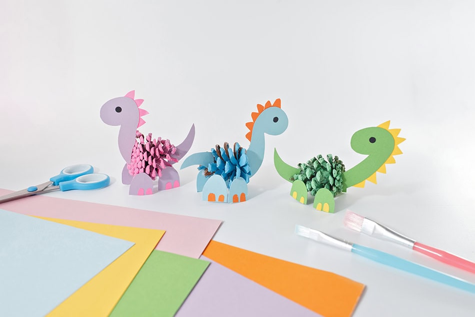 Children will love painting pinecones in bright colors and adding paper dinosaur features to create their own friendly dinosaur collection.