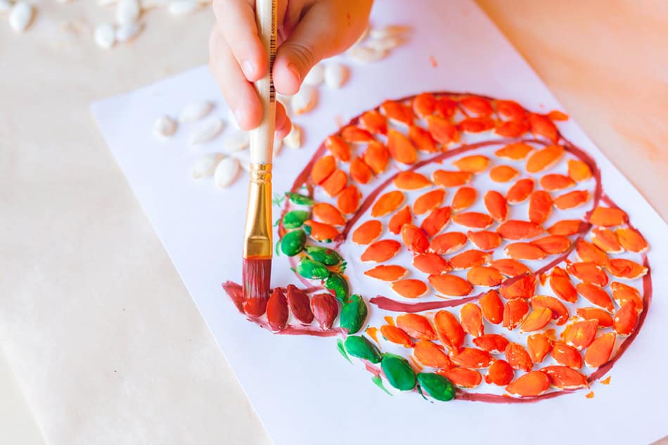 Kids will love the sensory experience of painting and placing seeds to fill their pumpkin shape.