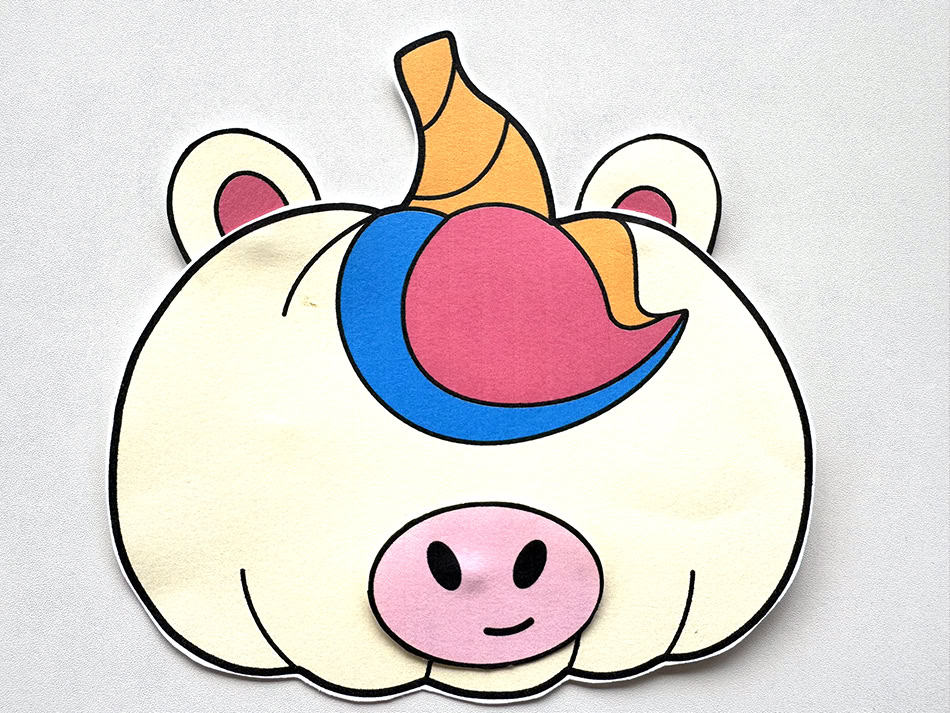 - Attach the pink nose and mouth piece to the bottom center of the unicorn's face